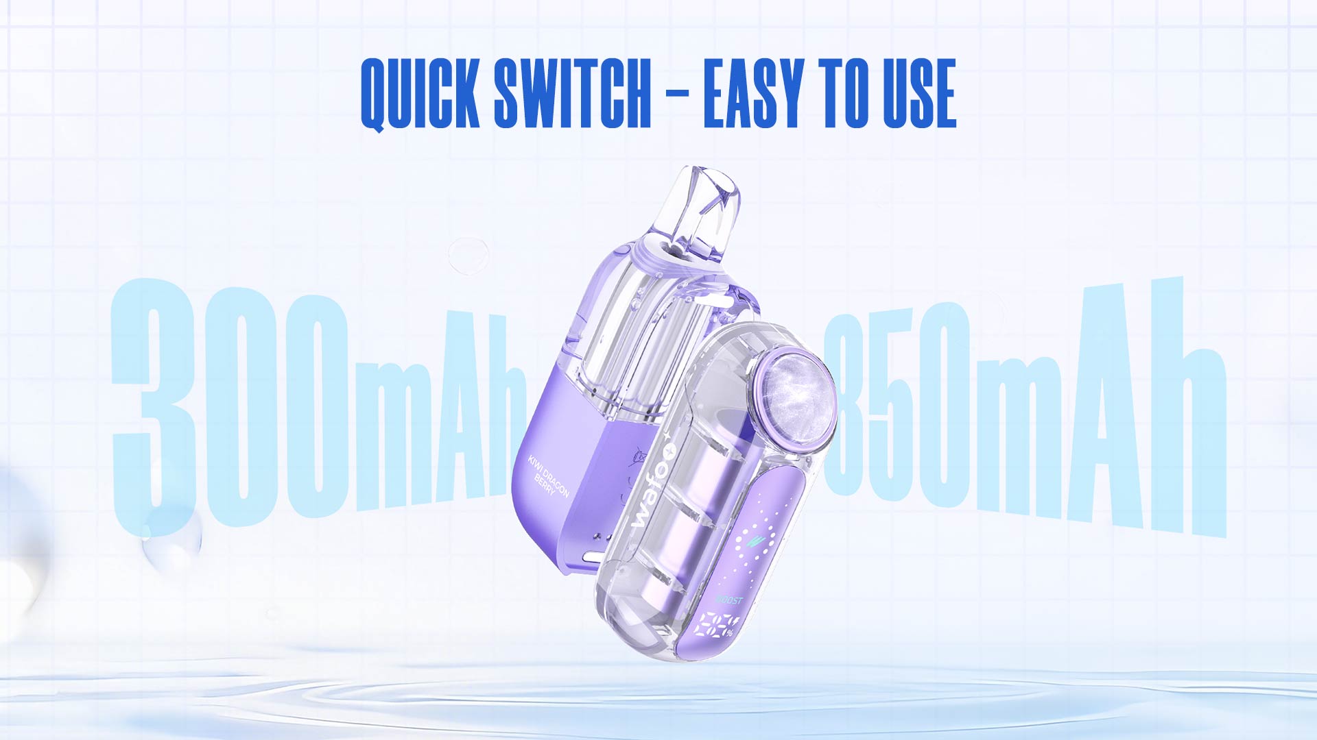 (4)300 mAh + 850 mAh BATTERY – Super Battery Life        (5)15 ML REFILLABLE TRANSPARENT TANK          (6)TWO MODES, ONE BUTTON, ENJOY THE LAST PUFFS