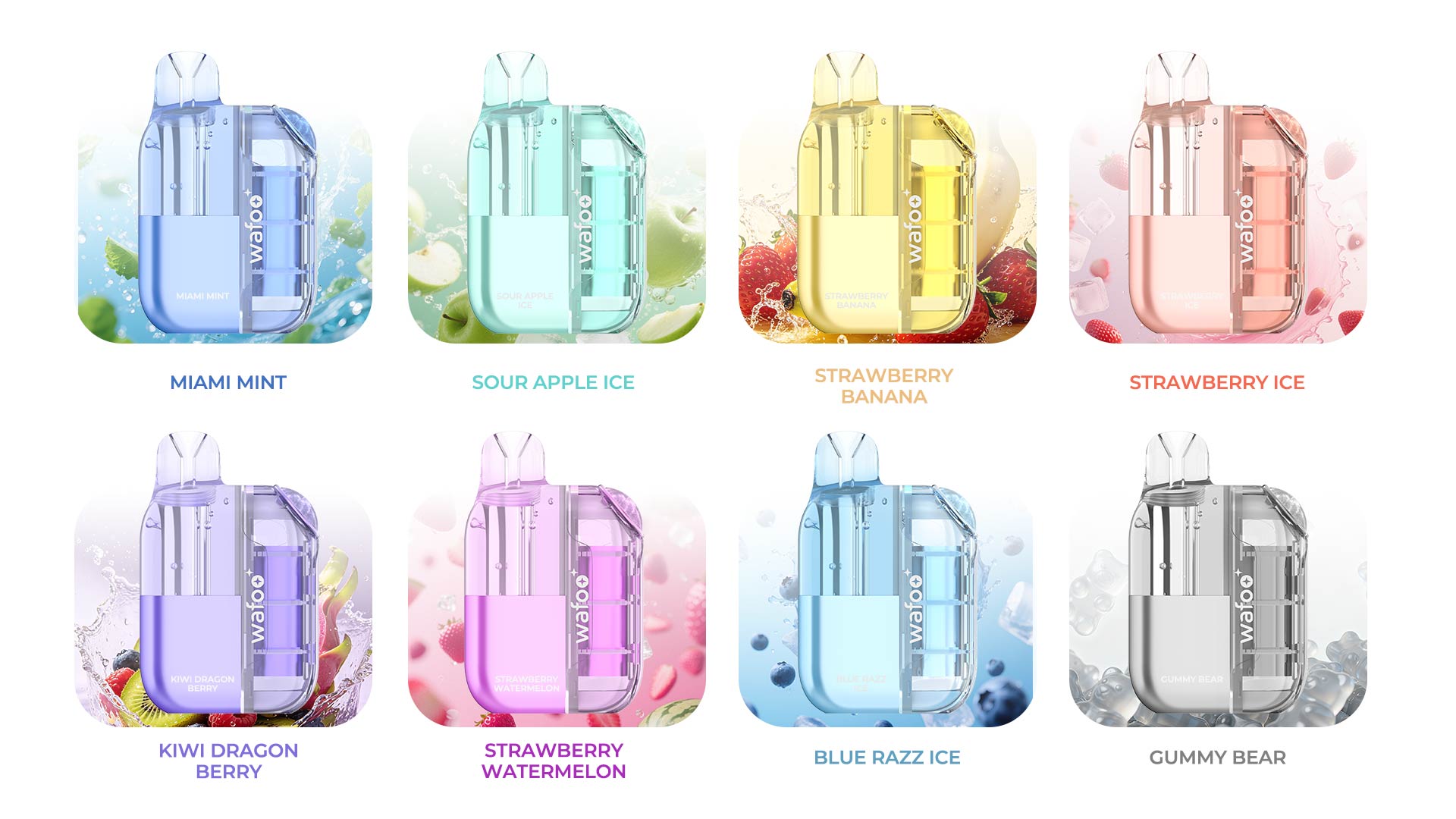 1)Sour Apple Ice    2 )Strawberry Ice    3)Miami Mint    4)Strawberry Banana    5)Kiwi Dragon    6)Gummy Bear    7)Strawberry Watermelon    8)Blue Razz Ice